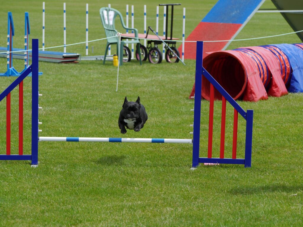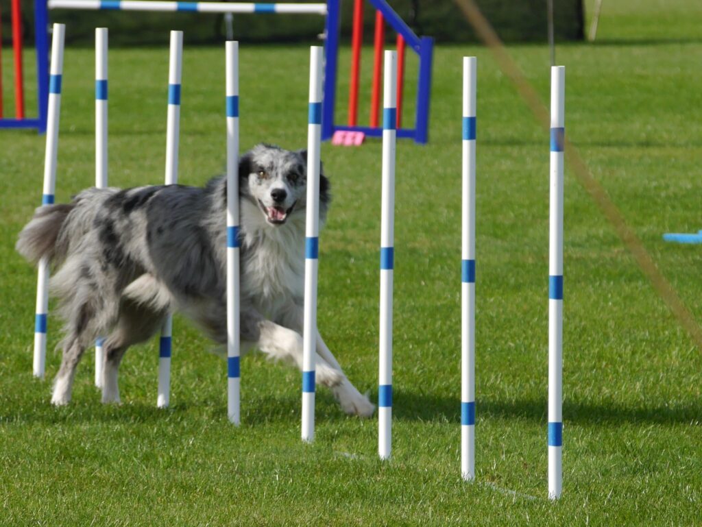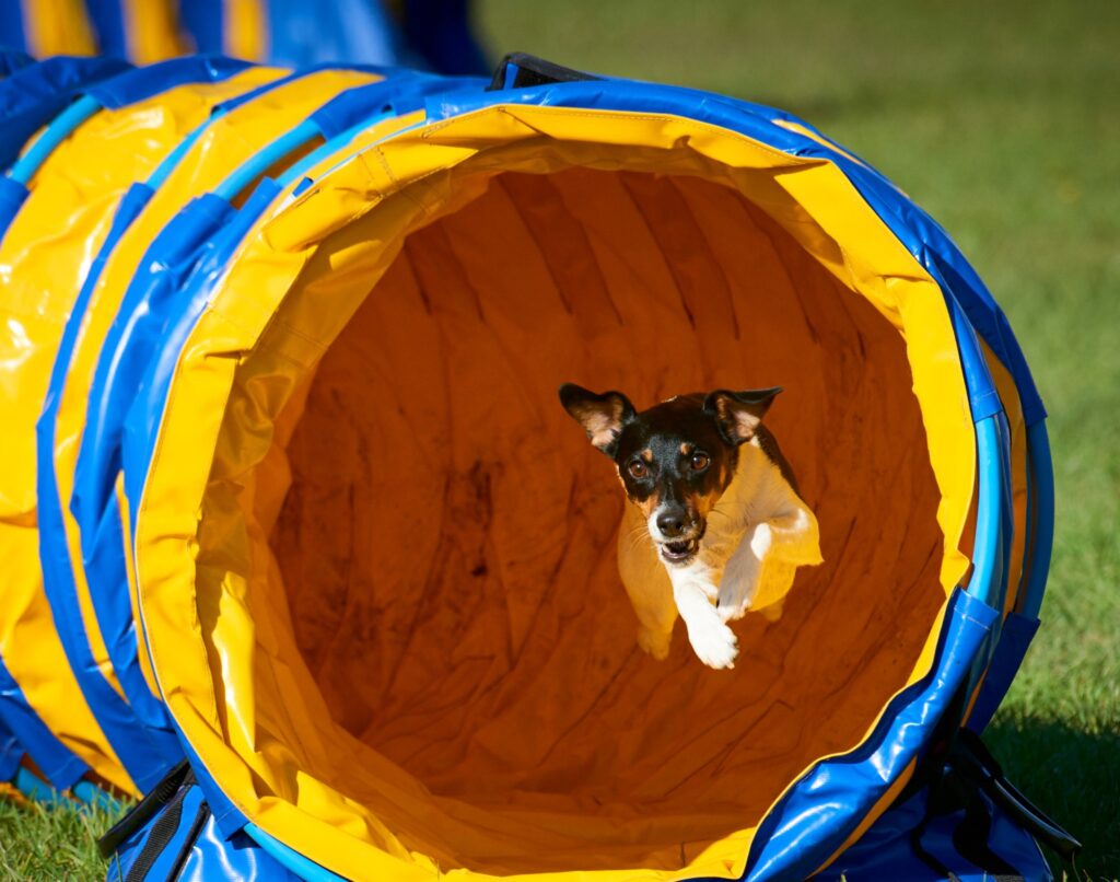 Dog agility is a competitive sport where dogs navigate through a timed obstacle course, which includes jumps, tunnels, weave poles, and other challenges. The goal